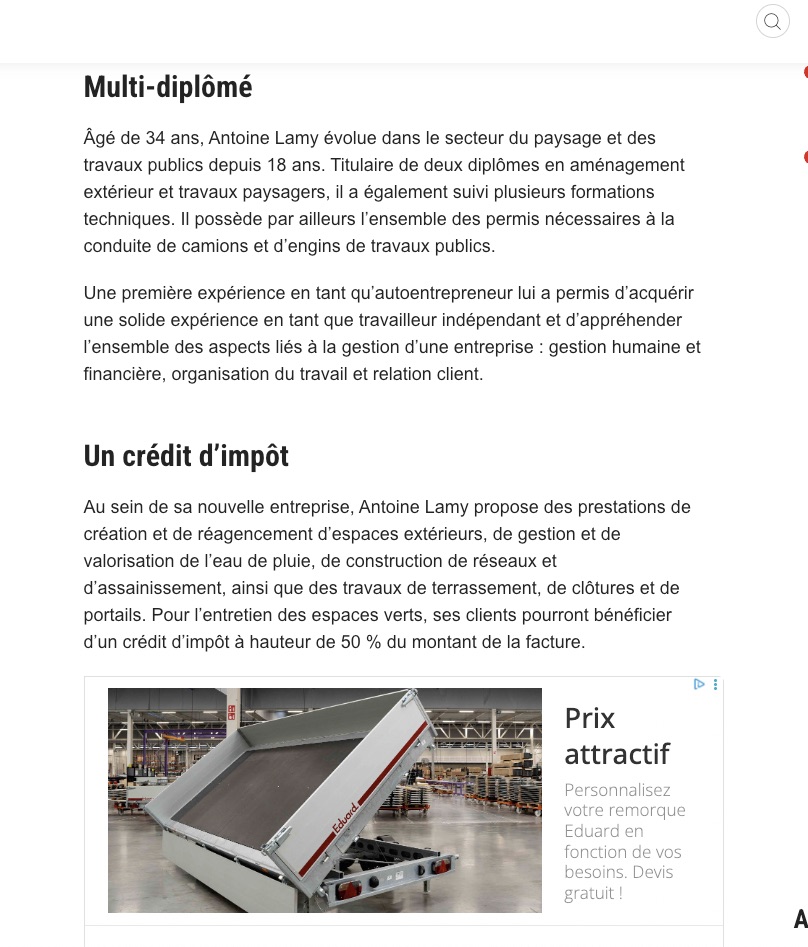 Bonjour! Je m’appelle Antoine LAMY, cela fais maintenant 18 ans que j’évolue dans les travaux du paysage et des travaux publics. J’ai construit mon catalogue de compétence pas à pas. D’abord apprentis en main-d’œuvre, puis en autonomie sur divers engins en de chantier, jusqu’à être promu responsable de la gestion de chantiers de plus en plus importants. Des formations reconnues viennent compléter ces années d’expérience sur le terrain: CAP Aménagement Travaux Paysagers, BPA Aménagement Travaux Paysagers, ainsi que de multiples formations liées à la technique et la sécurité.